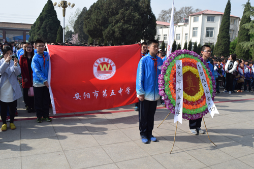 [五中] 3月31日上午,安阳市第五中学一百余名师生到烈士陵园开展了祭奠先烈活动。在烈士纪念碑前,师生们聆听着《国歌》、《我们是共产主义接班人》、烈士们的英雄壮举,心情澎湃,感恩先辈,决心立足本职,努力学习,以优异的成绩告慰先辈,报答祖国。在郭声镛烈士墓前,师生们和郭声镛烈士家属共同缅怀了这位伟大的校友。郭声镛,字金波,安阳城西大坡村人。郭声镛自幼品行端正,勤奋好学,1921年考入河南省立第十一中学(现安阳市五中前身)读书,1925年毕业后毅然报考了黄埔军校(第四期),是年冬加入中国共产党.1929年春,郭声镛和师长叶镛在广州慷慨就义,年仅25岁。学校领导和烈士家属共同为烈士敬献花篮,同学们怀着无比崇敬的心情向烈士行队礼、默哀,朵朵白花深切表达了对革命先烈的无限追思。同学们纷纷表示要珍惜今天的幸福生活,继承先烈遗志,踏着烈士的足迹前进,把祖国建设得更加强大,使中华民族傲立于世界。此次活动,使同学们受到了一次深刻的爱国主义教育,大家深深体会到我们现在幸福生活的来之不易,深深体会到是烈士们用鲜血铸就了我们灿烂的今天,坚定了自己用刻苦学习的实际行动来回报我们的革命烈士,决不辜负革命先烈的期望。