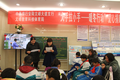 1月13日,文峰区教育科技体育局联合中原银行安阳文峰大道支行、举行了“大手拉小手•暖冬行动”爱心捐赠仪式。这天下午,来自文峰区的20名学生和家长来到了中原银行安阳文峰大道支行。虽然室外寒风凛冽,但是营业大厅里却是春意暖暖,爱心暖暖。20名学生虽然家庭贫困,但他们各个品学兼优。在活动中,文峰区妇联主席任红丽、中原银行安阳文峰大道支行行长黄小丽、文峰区教育科技体育局工会主席李卫霞向孩子们赠送了新年的礼物,鼓励他们继续努力学习,并在以后的日子里持续关注他们的成长。安阳市红庙街小学的侯晨宇代表受捐赠学生发言,他们决心不负期望,好好学习,不忘感恩,回报社会。参加活动的学生还在中原银行工作人员的引导下参加了小理财实践体验。