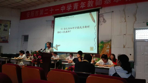 安阳市第二十一中学一贯重视教师培训工作,无论是“三个一”活动、教育技术能力培训等校本培训,还是上级机关组织的名师工程、骨干教师培训等,均能够积极参加,并制定有细密的培训管理制度。特别是2011年以来,针对日渐增大的青年教师群体,学校专门制定了青年教师成才计划并组织实施,使一批又一批的青年教师由青涩走向成熟,进而成为学校教育教学中的骨干力量、中坚分子。本学期在学校领导的关心和大力支持下,青年教师培训工作又有了新的亮点、新的突破,在每周进行教育理论学习、教育心得书写和硬笔书法的基础之上,又通过微信平台实时展示青年教师基本功训练进程,对培训工作起到了积极的推进作用。
