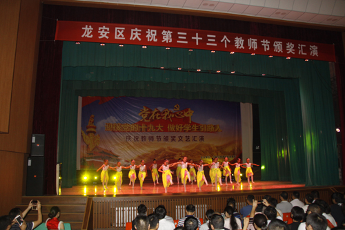 9月7日下午,龙安区在市妇女儿童活动中心举行主题为“党在我心中,迎接党的十九大,做好学生引路人”的教师节颁奖文艺汇演,表彰区优秀教师、优秀教育工作者、尊师重教先进集体和个人,共同庆祝第33个教师节的到来。